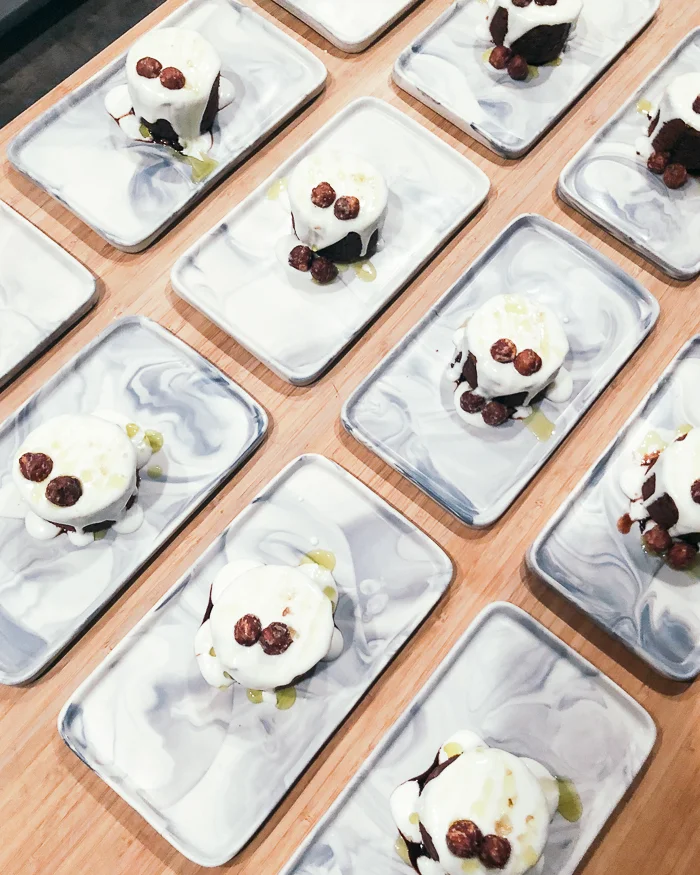 Hazelnut Brownie with goat cheese and raisins -- a rich and savory dessert, finished with olive oil and a sprinkle of flakey sea salt, help the chocolate and dried fruit notes of this delightful port shine.